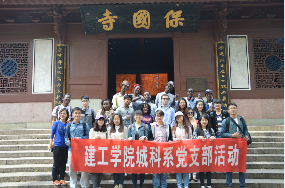 上午10点,党支部全体成员和留学生在4号教学楼102集合。首先进行的是“学唱校歌”,在吴燕丽老师的统一教学后,大家分成三组,分别由中国学生教留学生唱校歌。虽然他们的普通话不是很流利,但充满激情的留学生们一次次练习,很快就学会了整首歌曲,并以小组为单位上台为大家展示,由评委打分。根据成绩高低留学生们分组上台接受校徽佩戴。校徽佩戴仪式后,三位支部成员分别用英语向留学生们介绍了宁波市的三大标签—天一阁、北仑港、保国寺,让留学生们对自己宁波市有了一个更加丰富的了解。下午,一行人坐车来到保国寺游览,并进行实地学习。在悠扬的中国传统音乐中,大家迈着古老的台阶,穿过高耸茂密的树林,造访这座矗立了千年的古刹,学习这座木结构建筑神奇的榫卯结构、瓜棱柱、凿井等。