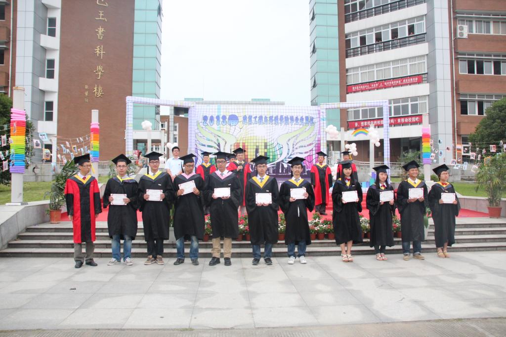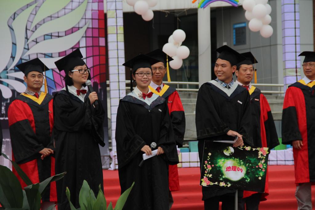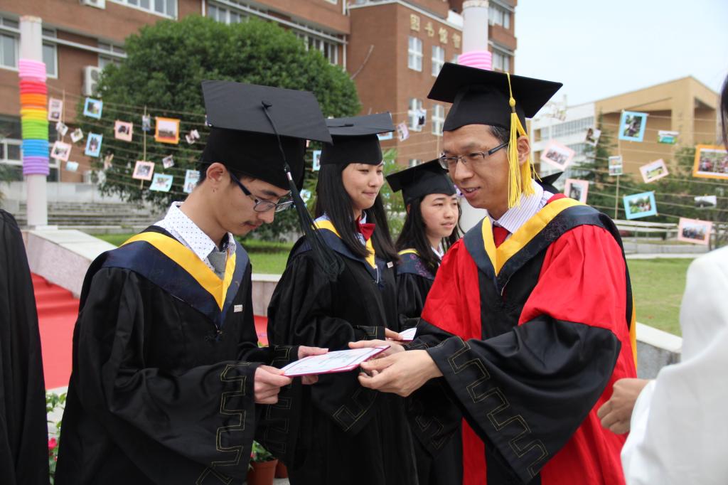 首先,院党总支书记王益澄教授宣布毕业典礼正式开始,并介绍出席此次典礼的领导和嘉宾。接着院党委副书记袁红辉老师宣布获得2013届省级、校级优秀毕业生荣誉的学生名单和获得“北仑房产”励志助学金的学生名单,由郑荣跃院长为“北仑房产”励志助学金的学生颁发证书。毕业生代表代表班级向学院赠送了礼物,并对学院几年来对他们的关心和教育表示了感谢。在学生感言后,学院院长郑荣跃教授对2013届毕业生表示祝贺,希望他们能脚踏实地,怀有理想之心,走出校门以后,继续关心、支持母校的建设和发展,在未来的人生道路上,拥有更加广阔的舞台。典礼的最后,学院领导们为毕业生授予学位(拨穗),请毕业生同学依次上台并合影。
