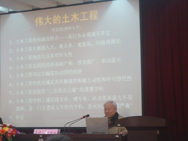 他首先从土木工程的特点和属性谈起,分析了土木工程的特点:与生活密切相关、资金投入多、工作需求量大等。通过列举鸟巢、三峡大坝、苏伊士运河等典型案例,生动形象地向在场听众诠释了土木工程的伟大之处,鼓励大家热爱所学专业,学好基础课程,以优异的成绩和出色的表现回馈社会。最后,崔教授回答了台下学生的提问,并做出了精辟的回答,让大家感到收获颇丰。