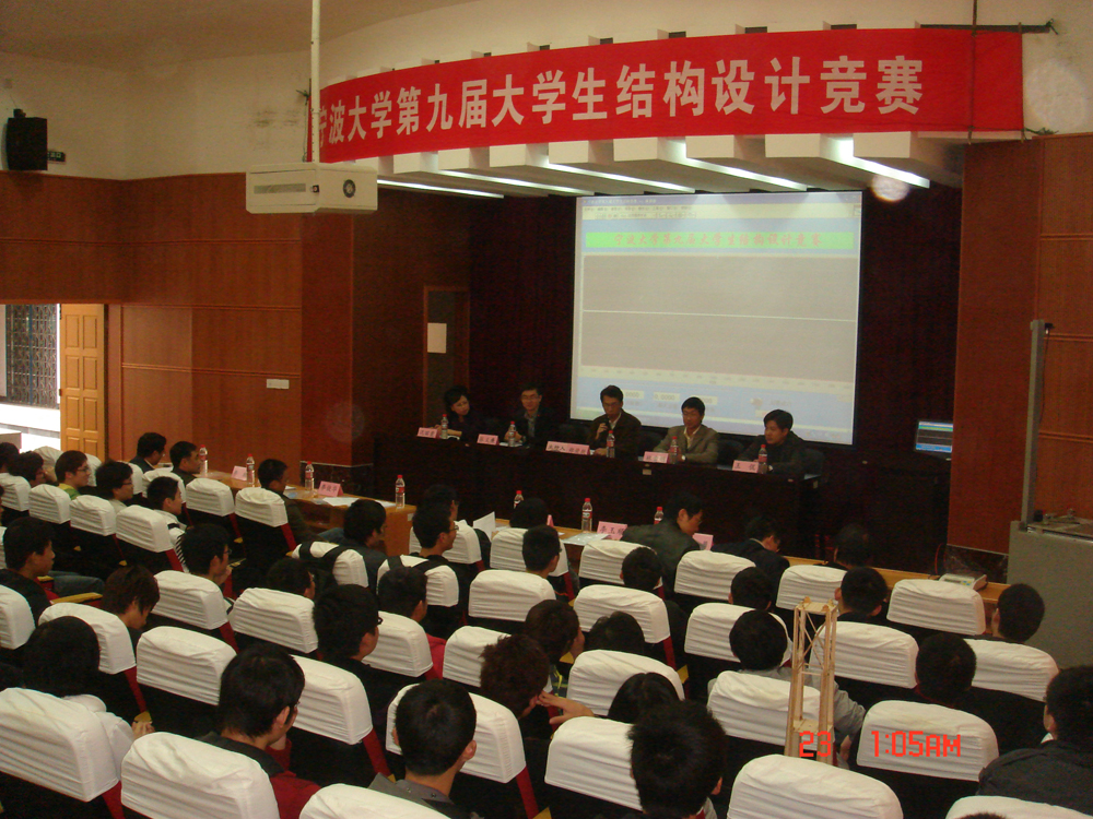 历届大学生结构设计竞赛的成绩,同时预祝大赛圆满成功。竞赛中,通过加载砝码和模拟地震的形式提供动力作用,来测试高层结构模型。专家组成员从方案设计、理论测试、模型制作、叙述答辩、加载试验5个方面的综合考评,最后从参赛的70件作品中评选产生了一等奖3名,二等奖6名,三等奖17名,并推荐其中部分作品参加今年4月下旬在温州大学举行的浙江省第九届“设计院杯”大学生结构设计竞赛。