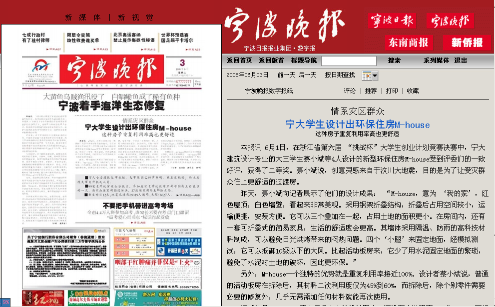 宁波晚报:情系灾区群众,宁大学生设计出环保住房M-house