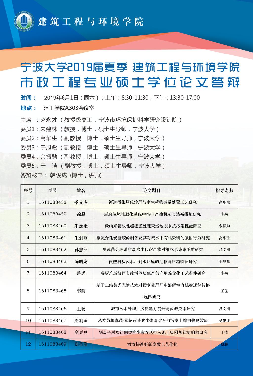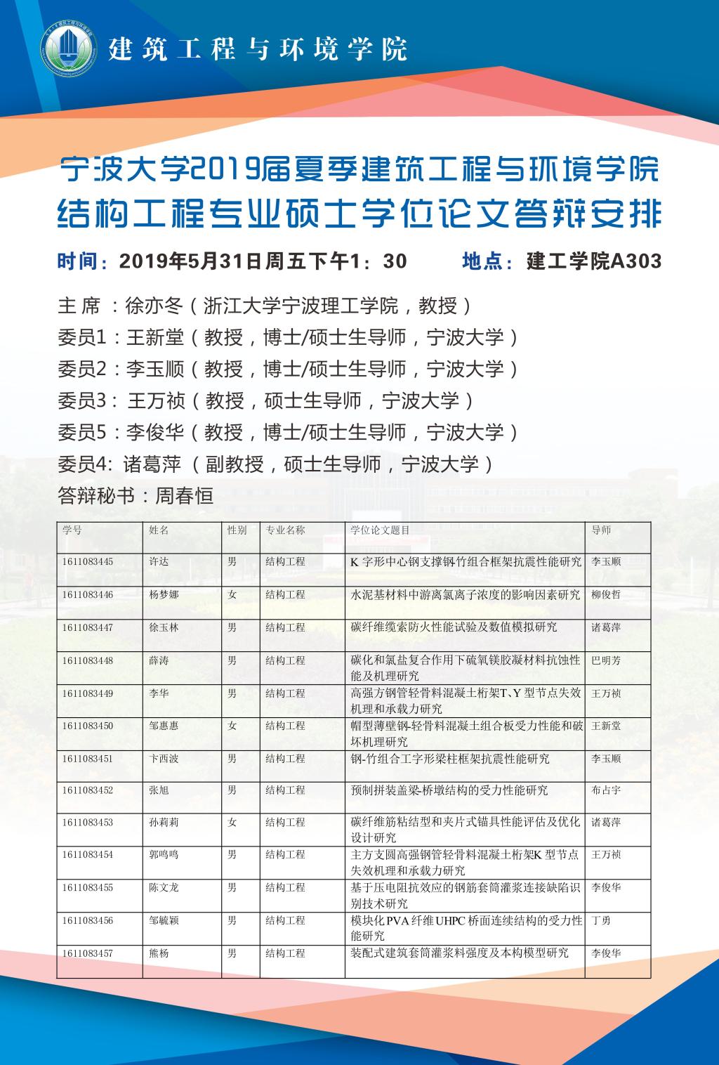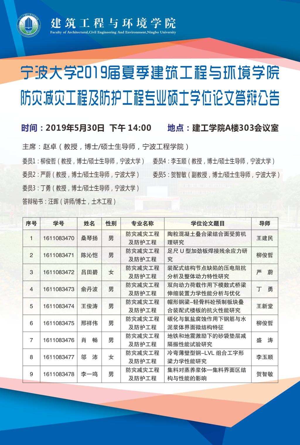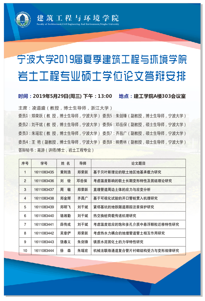 2019届夏季建筑工程与环境学院硕士学位论文答辩安排