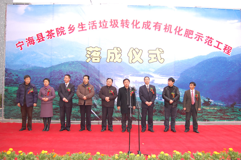 建筑工程与环境学院院长张殿发、宁海县人大主席杨加和、宁海县环保局局长陈炳寿、宁海茶院乡书记陈剑波、宁海茶院乡乡长蒌黛敏。各领导作了重要讲话,并为“宁海县茶院乡太阳能—生物集成技术反应器示范工程”揭牌。到会的领导和专家对该示范工程的科学性、实用性和经济性给予高度评价,建议在宁海县及宁波市全面推广,进一步优化农村生活垃圾三级处理模式,真正实现农村生活垃圾处理的减量化、无害化和资源化。