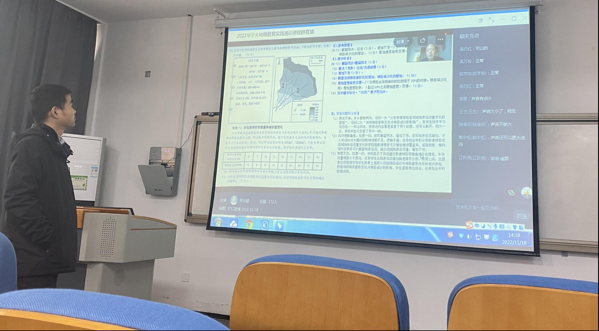 师范生在载物楼202教室全程参与市级教研活动。上午9:00-10:30徐皓老师和郑宇醒老师共同组织了《从格局-过程-机制视角提升地理问题解决能力——以“水—沙相互作用”为例》的线上听课活动和《从格局-过程-机制视角提升地理问题解决能力的课堂教学》的线上评课活动,下午14:00-16:00开展了《市地理选考模拟考试情况反馈》、《小切口设问复习方案与教学建议》、《关于提高读图能力的若干教学建议》这三场教研活动。观摩学习本次活动的同学主要为2020级地理科学(师范)全体本科生及部分线上听课的地理科学(师范)本科生。