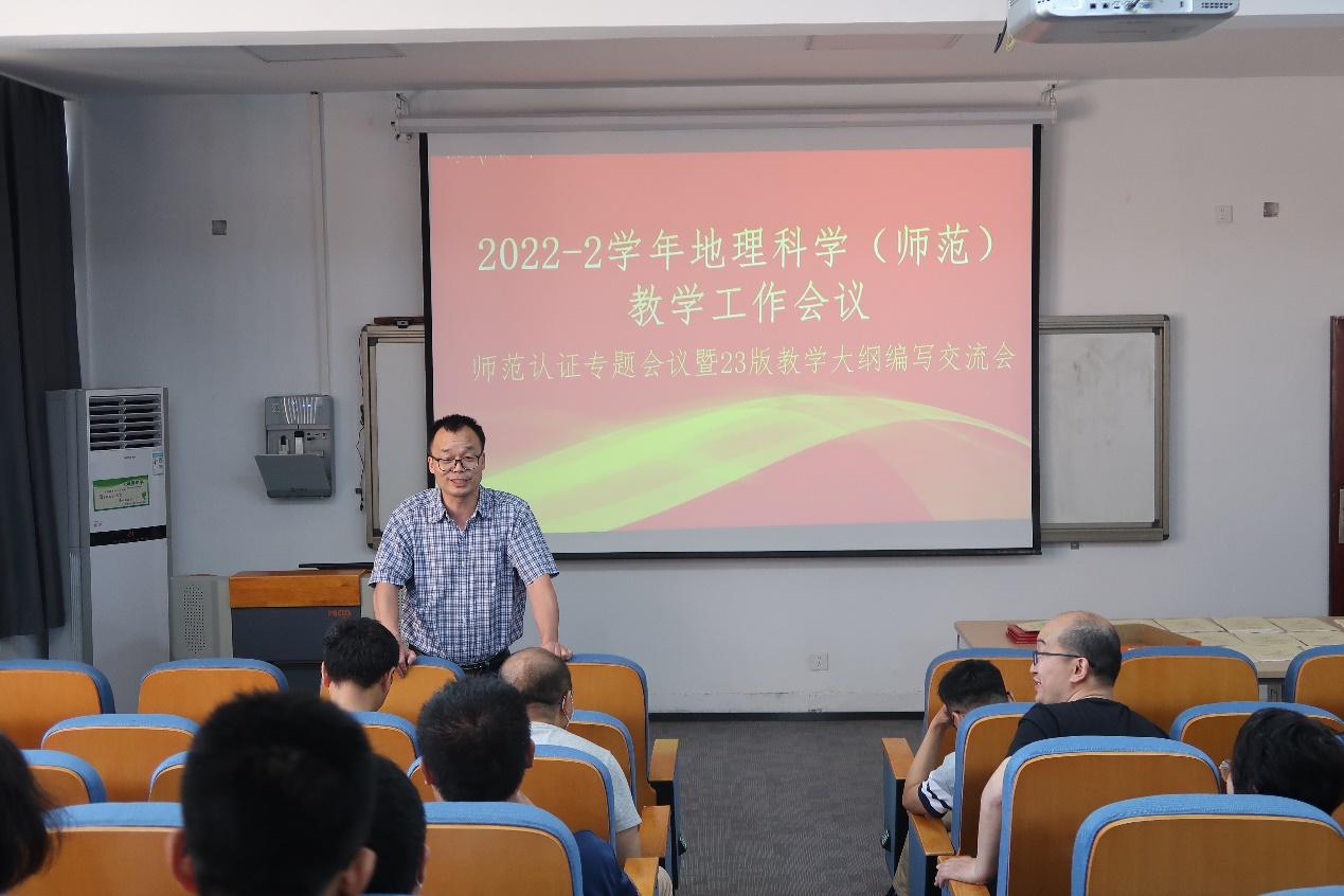 2023年5月29日中午,地理与空间信息技术系在载物楼202教室开展了本学期期中教学工作会议。本次会议的主题是:师范认证推进会暨2023版教学大纲编写交流会。会议由学院党委书记、地理科学(师范)专业负责人李加林老师主持。