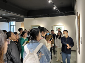 鄞江中学党委书记张力老师、地理教研组组长王玲老师等热烈欢迎了大家的到来,并一同与大家合影留念。随后,同学们跟随王玲老师开始参观校园,在地理活动室内,王老师向大家一一介绍陈列的地理教具以及学生们的地理手工作品;在艺术藏品展览厅里,沈炜慧老师对每一幅水彩、水墨画和书法作品都展开细致的描述;在图书馆、阅览室中,王老师亲切地与我们谈起鄞江中学学生的日常作息时间。简短的校园参观在不知不觉中便拉近了同学们与鄞江中学的距离,使大家快速融入其中。