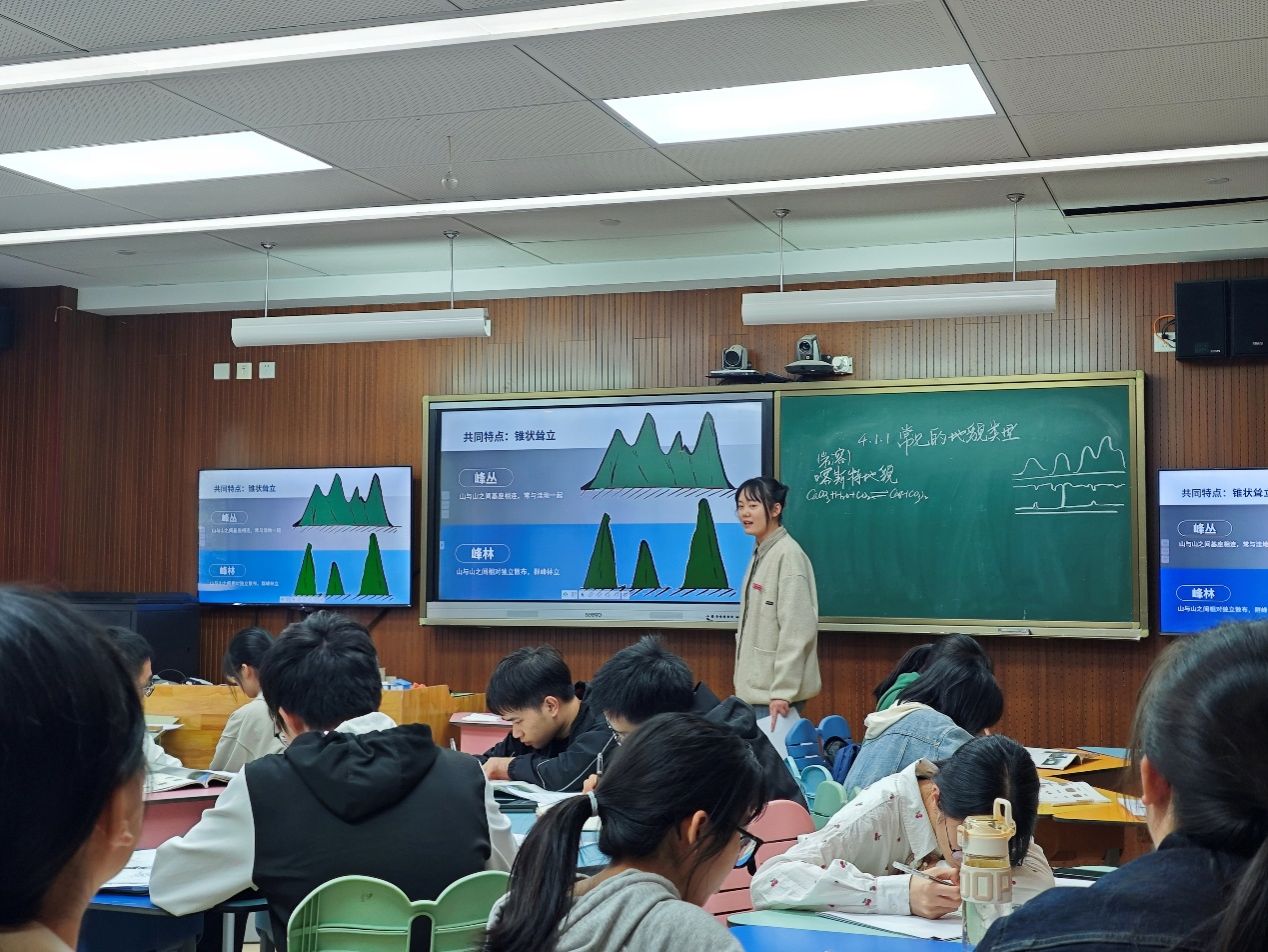 根据《地理教研创新训练》课程目标要求,本次活动邀请了正在宁波市第四中学进行教育实习的21级地理科学(师范)班同学,按照同课异构授课的形式讲授中学地理必修一第四章第一节《常见地貌类型》喀斯特地貌和河流地貌部分内容,随后进行了师生评课与教学设计讨论、交流。通过本次活动,同学们在解读课标、分析学情、建立地理教学逻辑等方面有极大收获,对课堂活动设计和实际授课讲演方式有了更深刻的理解。