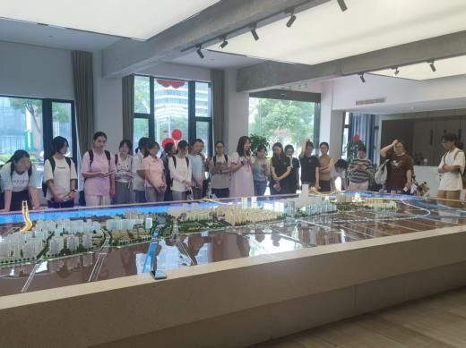 在文创港片区,同学们通过观察文创港大厅内的沙盘模型,邀请在此工作的宁波大学地理与空间信息技术系人文地理学硕士毕业生姚丹学姐讲解,我们了解到文创港建设规划以及其落地实践过程的详细内容,包括最初的规划蓝图开始,逐步深入到实际的落地执行阶段,为我们展示了整个项目的全貌。学姐详细阐述了如何对工业遗存,例如老火车北站的站房、铁轨和仓库等进行保护性改造,并且创新性地利用这些资源。同时,也讲解了可以通过精准引入新业态,并通过这些业态的集群效应,进而推动文创港地块及孔浦街道有机更新和经济社会高质量发展;对滨水公共空间进行开放性设计,通过设计激发这些区域的活力,营造出充满活力的公共空间。在解读“港埠复兴”战略的生动案例中,同学们对城市规划更新和产业发展有了更深刻的理解。