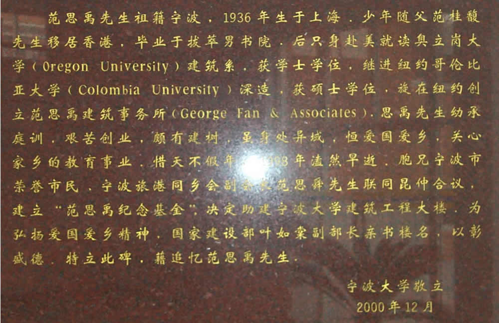 范思禹先生祖籍宁波,1936 年生于上海,少年随父范桂馥先生移居香港,毕业于拔萃男书院,后只身赴美就读奥立岗大学 (Oregon University)建筑系,获学士学位,继进纽约哥伦比亚大学 (Colombia Universitv ) 深造,获硕士学位,旋在纽约创立范思禹建筑事务所(George Fan & Associales )。思禹先生幼承庭训,艰苦创业,颇有建树,虽身处异域,恒爱国爱乡。关心家乡的教育事业、惜天不假年,1998年溘然早逝。胞兄宁波市荣誉市民,宁波旅港同乡会副会长范思舜先生联同昆仲合议,建立“范思禹纪念基金”,决定助建宁波大学建筑工程大楼,为弘扬爱国爱乡精神,国家建设部叶如棠副部长亲书楼名,以彰盛德。特立此碑,藉追忆范思禹先生。