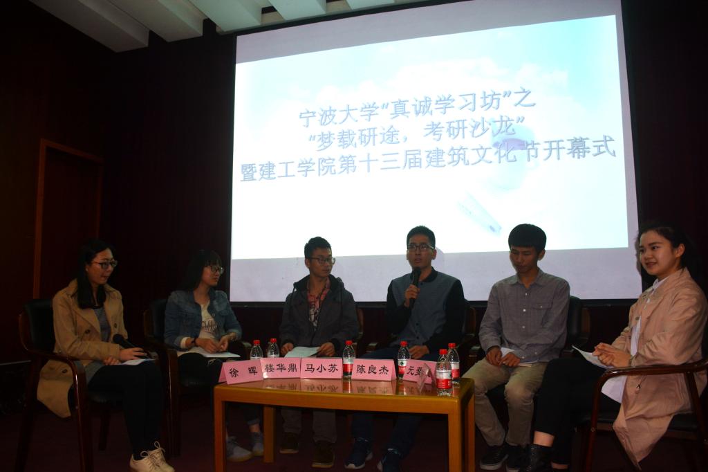 开幕式中,学院党委副书记首先指出要将建筑文化节持续不断地发展成为一个具有校友影响力的品牌,同时不断挖掘学院创新创业工作的内涵,培养出更多优秀的建工学子。随后,马小苏等同学分别介绍了对考研信息的了解过程以及有效的复习方法。其中,还强调了明确报考学校、合理安排时间、科学利用网络资源以及有效及时地与导师沟通等问题。被保研至哈尔滨工业大学土木工程系的陈良杰同学分享了其保研之路并给学弟学妹们提出建议。最后,同学们踊跃提问,如考研准备时间、考研成功与否和平时成绩的关系等问题。