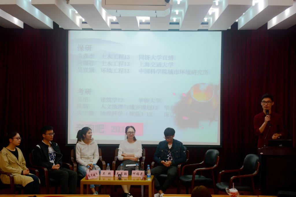 座谈会伊始,作为考研保研成功的学长学姐们分别分享了他们各自的经历,也让同学们初步了解到有关于考研保研的相关流程和注意事项。直博同济大学的童森杰同学以历年同济大学的分数线为例,讲述了自己关于保研的经验。他说考研不一定好的大学就比差的大学难考,还要看专业水平和许多其他的因素,不能一概而论。此外,他还说关于考研最重要的一点是要不断地问自己:“我能不能以及适不适合静下来专注地做一件事?”如果可以,那么也许考研是一个不错的选择。何锡存同学分享了他参加上海交通大学夏令营并成功保研的经历,让同学们知道要敢想敢拼,也许就会成功。保研中科院城市科学研究所的吴直颖同学则讲述了关于论文发表和学术严谨的重要性,成功考上华侨大学的吴艳同学以自身的经历告诉大家考研需早作准备,考研华东师范大学的陈炳同学和考研南京师范大学的朱宇婕同学也分别分享了自己的备考经验。最后,现场的提问环节也进行地十分热烈,可见学院同学们对考研保研的兴趣浓厚。