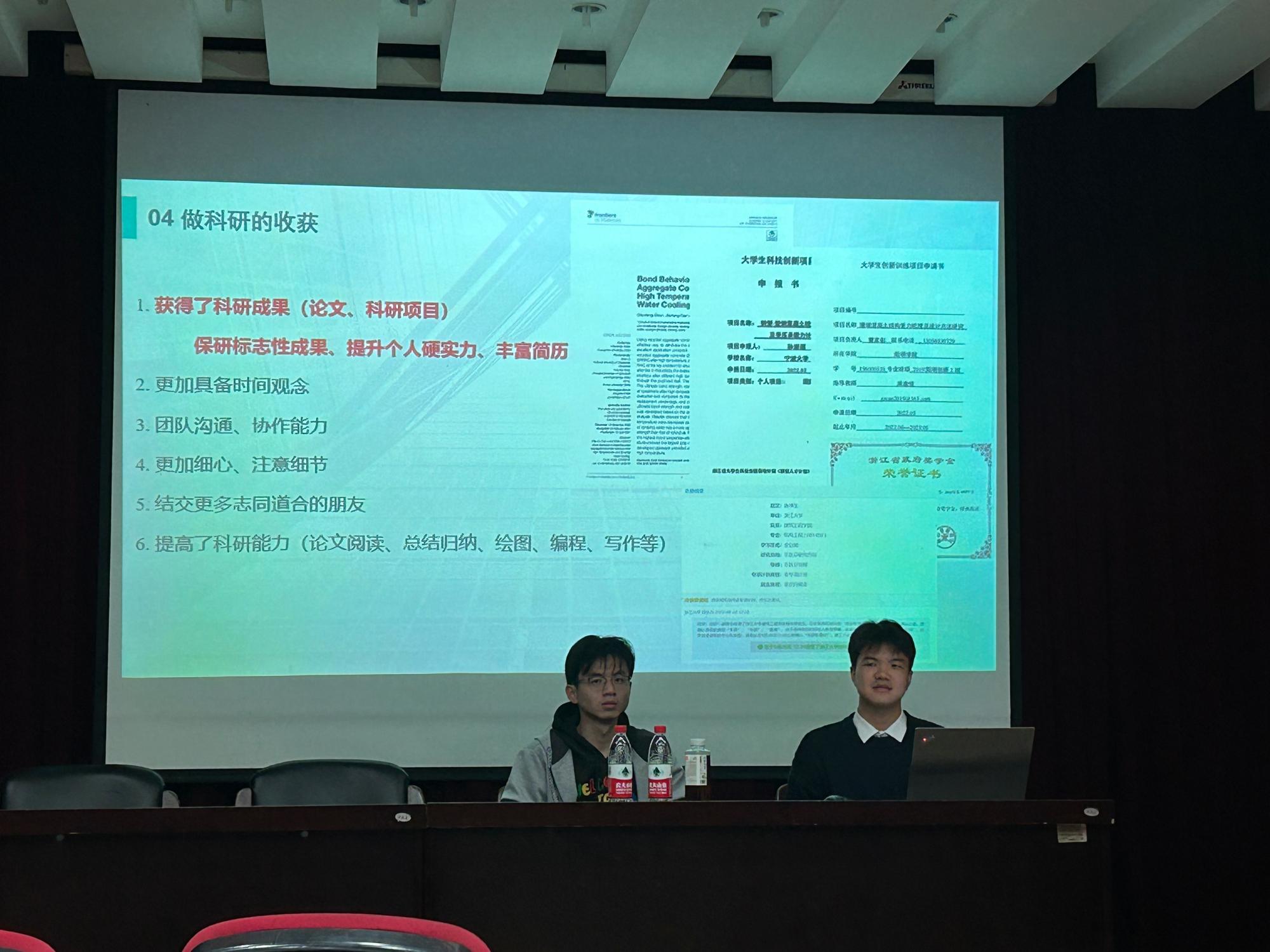 19级阳明创新2班工程管理专业曹家彰学长主要从他自己的第一篇英文论文的撰写过程出发,从论文课题的实验过程中告诉学弟学妹们在科研当中需要注意细节,需要保持耐心和毅力。在数据处理和论文撰写的过程中,他告诉我们需要注意论文阅读量的积累,推荐了Origin作为画图的软件,Zotero作为文献处理和归纳的工具,为学弟学妹们做了科研基础的启迪。19级土木工程2班易昕政学长主要从为什么想做科研以及如何开始科研的角度出发,跟同学们讲做科研需要做好的准备。科研是一项不易的事情,他还提到,最重要的是要有责任心和保持耐心,自己要有高度的精神状态与充沛的责任心,失败是常有的事,唯有坚持才能取得成果。