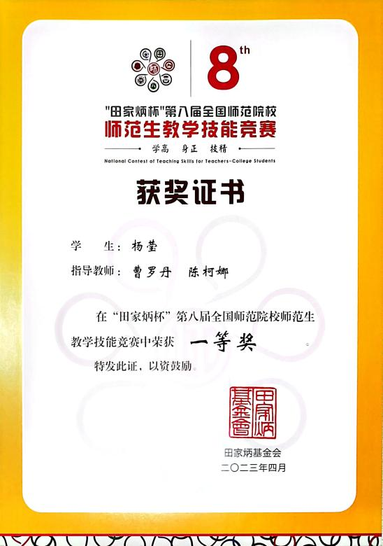 “田家炳杯”全国师范院校师范生教学技能竞赛是师范专业最高级别师范生教学技能竞赛,在曹罗丹特聘副研究员和宁波三中陈柯娜老师的指导下,蜜桃视频 学子杨莹荣获全国一等奖!