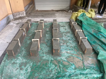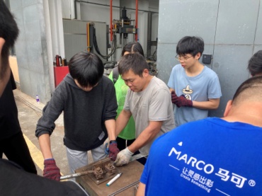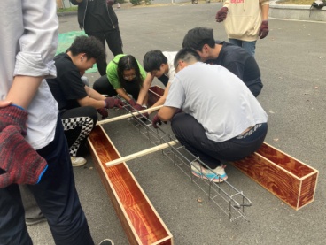 虽然钢筋混凝土梁是土木工程专业中最基本和最常用的构件,对于学生而言并不陌生,但制作钢筋混凝土梁的工序较多且很多操作是课堂上无法传授的。首先,学生们观看指导老师和工匠们的示范教学,然后学生们戴着手套,拿着榔头敲钉子组装木模;在操作台上折弯钢筋,用扎丝绑扎钢筋骨架,固定保护层垫块,最后小组成员们一起齐心协力将钢筋骨架抬入木模,上午各组顺利完成了钢筋骨架模型的制作。下午,学生们在指导团队的带领下,分工合作,进行了场地准备、原材料称取、混凝土配制、浇筑、振捣密实和覆盖薄膜养生等工作,各组圆满完成钢筋混凝土梁的制作。