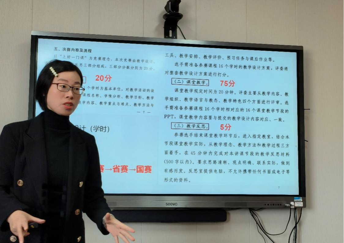 在培训会上,季林丹老师首先介绍了国家对于“青教赛”和“教创赛”赛事的政策支撑背景,并解读了相关文件;通过详细对比了两种赛事的区别,让教师们对两大赛事有了更清晰的认识。随后,季林丹老师分享了参赛评选的关键要点及注意事项;她强调了参赛教师需要在教学内容、教学方法和教学效果等方面做好充分准备,同时也需要关注学生的反馈和评价。