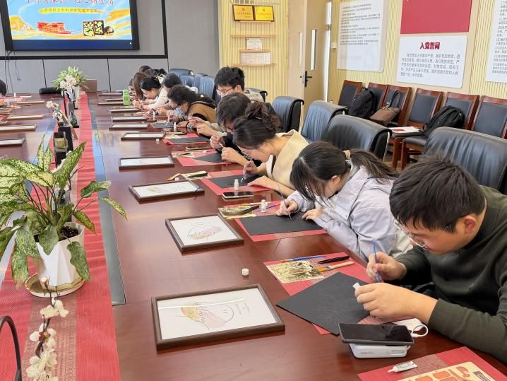 在创作金箔画时,师生党员们化身“非遗学徒”,从勾线、上胶到贴箔、扫箔,每一步都凝神专注。有人选择绘制中国地图,寓意着每一位党员心中那份“一寸丹心图报国”的赤诚与担当;有人选择勾勒挺拔的翠竹,竹节分明的线条里藏着对“守节如竹”的期许;还有人偏爱绽放的青莲,金箔覆上的花瓣泛着温润光泽,恰似廉洁品格的纯粹通透。