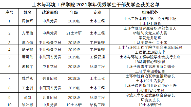 关于土木与环境工程学院2021年度“优秀学生干部奖学金”获得者名单公示