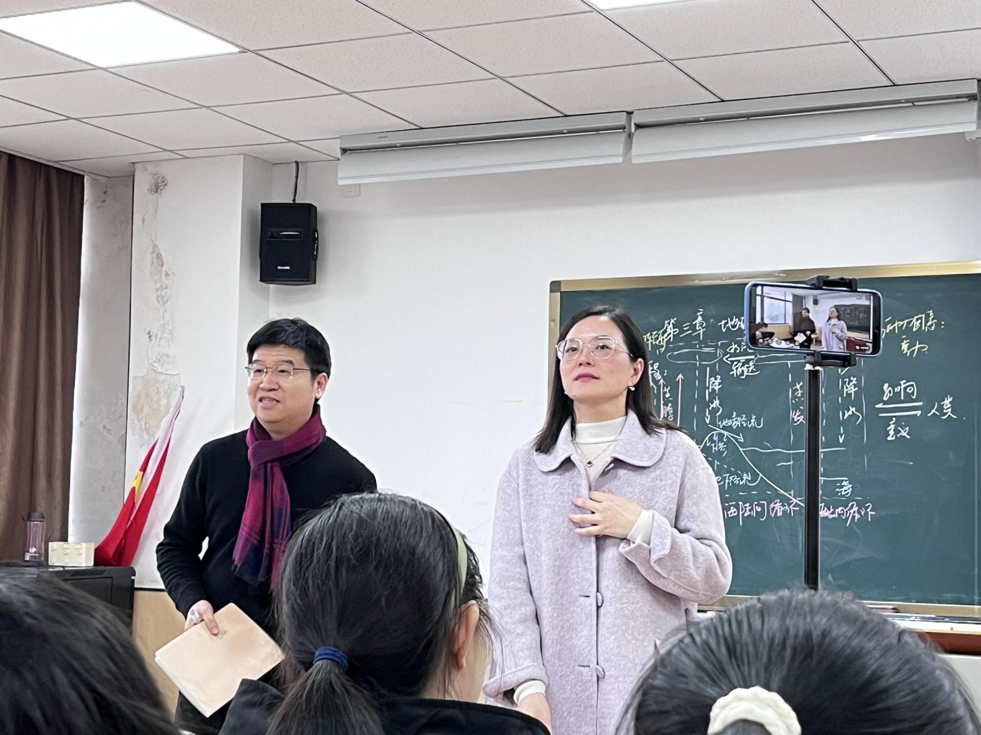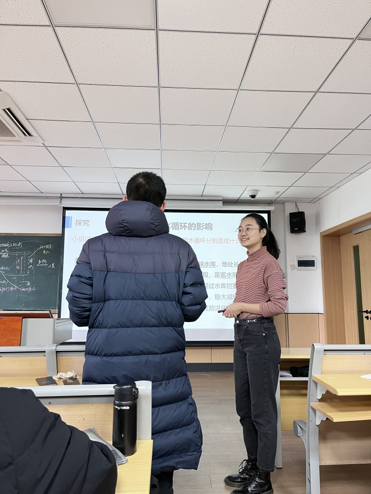 讲课结束后,两位导师在表达了对其授课风格、内容的赞赏之后,又提出了对于本节课基于自身经验的改进建议。周红星老师强调中学老师在课堂教学过程中要注重对学生地理实践力的培养和落实,譬如在水循环这一章节的授课过程中,可以尝试让学生自主设计、完成水循环模拟实验,通过真切地体验,锻炼学生的思维敏性和试错改进的实践能力。而虞文君老师则指出,新手老师在落实知识点的同时需要努力建设高效率的课堂,合理的运用图象、表格和数据将信息具象化,从而激发学生思维。除此之外,教师要从知识以及认知两个维度把握学生的学情,将地理的“道”和教学的“术”有机融合,进而创造出极具美感的地理课堂。