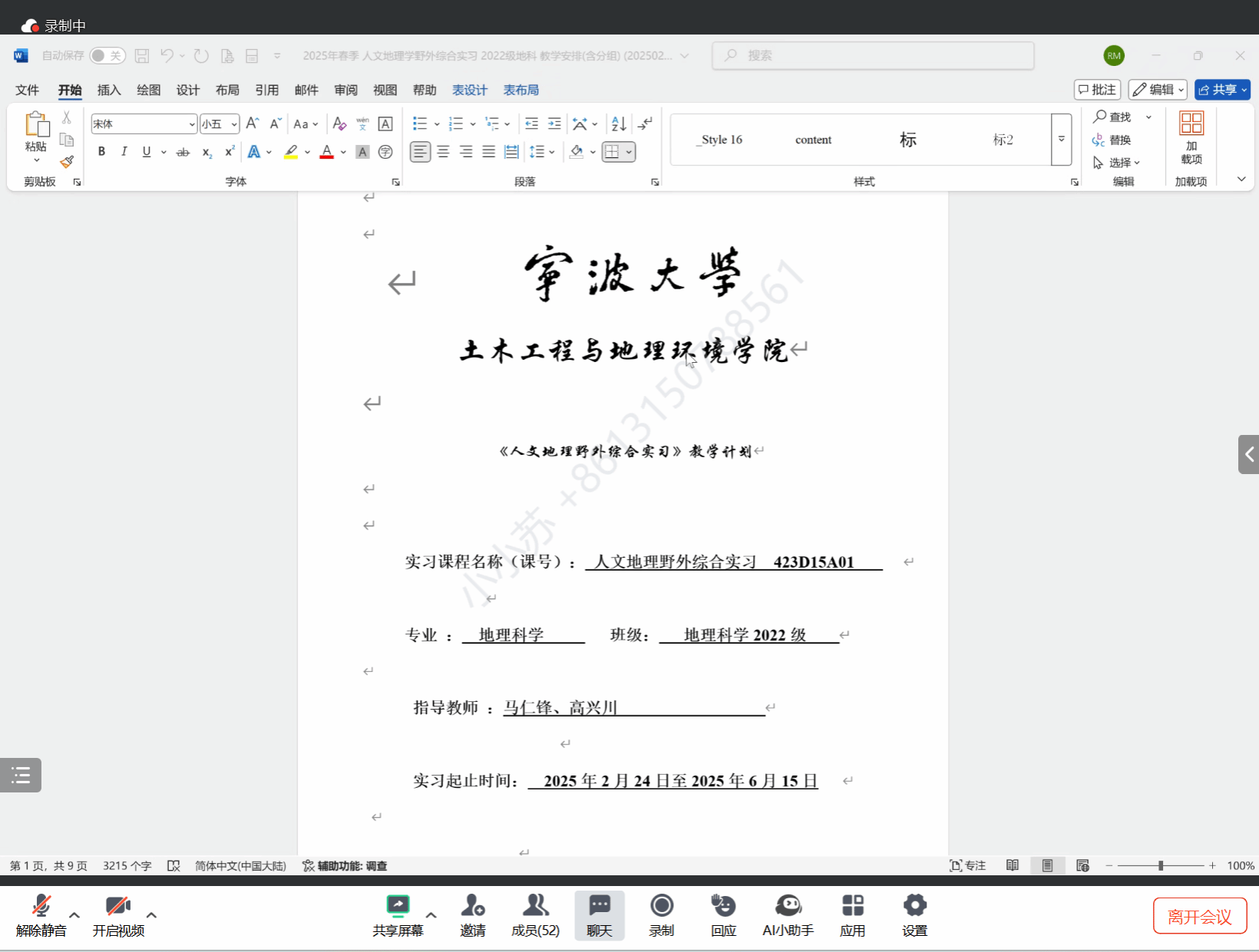 为确保2022级本科生《人文地理综合野外实习》课程的顺利开展,保障实习活动的安全、有序和高效进行,2025年2月26日晚8点,2022级地理科学(师范)班在线上举行了人文地理综合野外实习动员大会,实习指导老师马仁锋、高兴川、金文纨以及课程全体同学参与了本次会议。