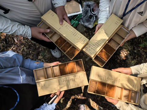 2025年5月24日上午,2023级地理科学(师范)在高梅香、杨晓东、罗旭、许洺山、夏然等老师及地理学研究生的带领下,前往宁波天童国家森林公园开展为期一日的《土壤与生态》课程野外实习。同学们在老师的引导下开展了分层采集土壤剖面、采集土壤分析样品、调查植物群落和制作植物标本等活动。在实习中,同学们将课内知识转化为立体知识,将天童山装进背包,诠释了宁大地理人致知于行的探索精神。