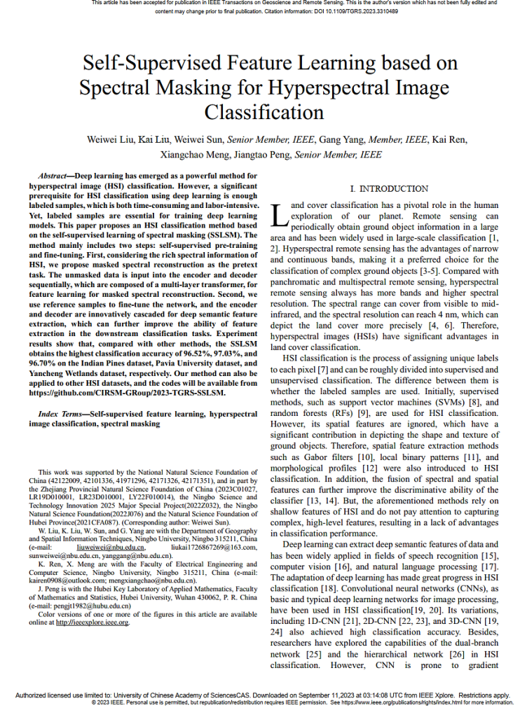 基于光谱掩膜的高光谱图像分类的自监督特征学习 (IEEE Transactions on Geoscience and Remote Sensing, 2023)