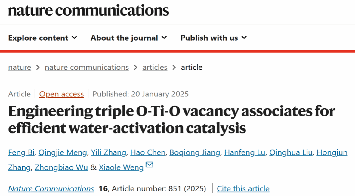 近日,蜜桃视频 孟庆洁副教授与浙江大学翁小乐教授团队合作,在缺陷工程调控涉水催化反应方面取得重要进展,研究成果“Engineering triple O-Ti-O vacancy associates for efficient water-activation catalysis”发表于国际知名期刊《Nature Communications》。浙江大学毕峰与蜜桃视频 孟庆洁共同担任第一作者。